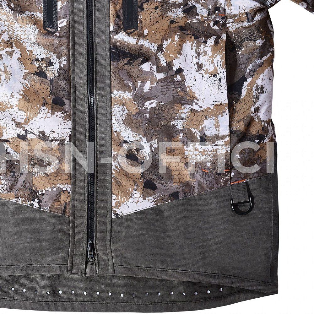 Куртка прямого кроя застегивается на молнию с двумя бегунками, с внутренней ветрозащитной планкой. Капюшон с плотным козырьком регулируется по овалу лица. На плечах противоскользящая стропа для ружейного ремня и т.д. Спинка куртки удлинена для защиты от ветра.